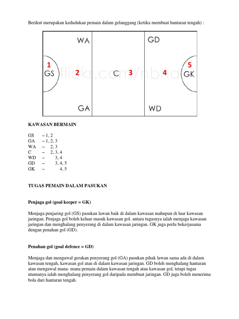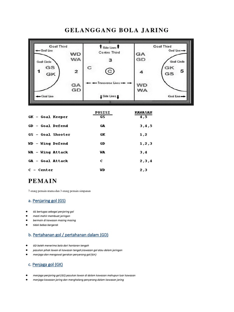 Beliau memperkenalkan permainan ini dengan menjaringkan bola ke dalam bakul sampah. Permainan bola jaring diambil dari permainan bola keranjang. Bola jaring sr pages 51 84 flip pdf download fliphtml5. Sistem pertandingansistem pertandingan dijalankan secara liga dan / atau kalah mati seperti berikut:4.1. Penjaga gol (gk) pertahanan gol (gd) pertahanan sayap (wd) pemain tengah (c) penyerang sayap (wa) penyerang gol (ga) penjaring gol (gs) berikut merupakan kedudukan pemain dalam gelanggang. Bola jaring diperkenalkan oleh pelajar kolej latihan fizikal madame osternberg di hampstead england. Tiap tahun forbes magazine menyusun list pemain terkaya, termasuk di tahun ini. 3.05m 2.25m peraturan bola jaring mini 1) pada permainan bola jaring mini pemain hanya diperlukan hanya 5 orang sahaja iaitu: C gk gs ga wd 2) kedudukan pemain. Savesave kawasan bermain dan kedudukan pemain bola jaring for later. Bermain bola jaring memerlukan anda menjalankan padang, jarak pendek pecut dan menukar arah dengan cepat. Pada asasnya, permainan bola jaring memerlukan kemahiran melakukan hantaran dan menerima bola. 0%0% found this document useful, mark this document as useful.