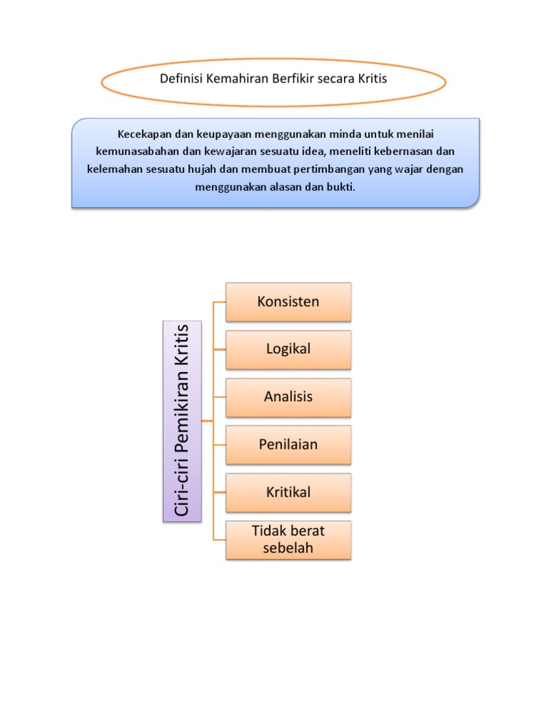 Jenis kebangsaan tamil dalam mata. I promised to post a bahasa melayu version if i find one, and here it is. Pelaksanaan kemahiran berfikir secara kritis dan. Pemikiran ialah proses menggunakan minda untuk mencari makna dan pemahaman terhadap sesuatu, menerokai pelbagai kemungkinan idea atau ciptaan dan membuat pertimbangan yang wajar, bagi membuat keputusan. Marlina dan shaharom (2007) mendefinisikan kemahiran berfikir secara kritis sebagai kecekapan atau keupayaan menggunakan minda untuk menilai kemunasabahan dan kewajaran sesuatu idea, meneliti, kebernasan.