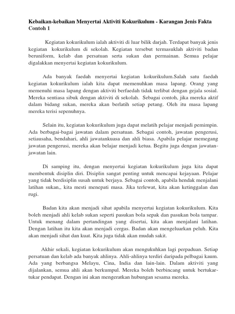 Situasi begini boleh melahirkan pelajar yang kurang sihat dan ia memberi impak di masa yang akan datang. Kebaikan sukan yang akan diperoleh apabila pelajar menyertai aktiviti sukan adalah mampu melahirkan masyarakat yang sihat tubuh badan dan minda yang cerdas. May 04, 2020 · ipendidikan » karangan » kebaikan dan faedah menyertai aktiviti kokurikulum disemak dan dikemaskini pada pukul 8:17 pm, 4 mei 2020 tajuk soalan karangan bahasa melayu yang bertemakan pelajar sekolah sering kali menjadi pilihan pembuat soalan. Jul 20, 2014 · naveen96 14 menganggap menyertai kegiatan kokurikulum hanyalah membuang masa dan mereka mahu masa tersebut hanya untuk memenuhi keperluan mereka sendiri, seperti untuk menghabiskan melayari laman sosial di rumah dan kafe siber. Kegiatan sukan yang diceburi oleh pelajar sekolah mampu menjadikan badan mereka sihat, sekali gus dapat mengelakkan diri mereka daripada menghidap sebarang penyakit berbahaya.